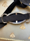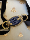 Completing the ensemble is its coordinating belt, featuring an oval buckle adorned with raised sapphire-toned cabochons framed by gilt leaves. I have been searching for the perfect dress to pair with this incredible 30's belt buckle and am thrilled to have finally found the perfect match. The belt ties in the back and the ribbon can be swapped for different colors or fabrics.