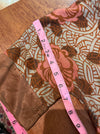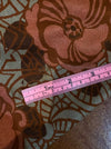 An original 1920s silk day dress in a striking Art Deco floral print. Rendered in warm shades of russet brown and coral pink, the pattern features bold stylized blossoms layered over a geometric trellis motif—a perfect example of the modernist textile designs of the Jazz Age. The dress is cut in the classic straight silhouette of the 1920s, lightly shaped to the body but still relaxed, with short sleeves and a dropped waistline seam subtly defined near the hem. Contrasting solid silk is used for the smart pointed collar, sleeve cuffs, and hem border, lending the piece a tailored finish. A shallow V neckline adds a feminine touch. Slips on over the head with a bit of stretch to the fabric.