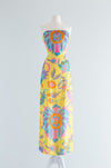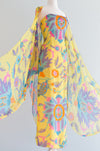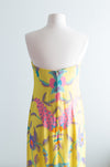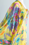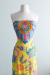 My favorite evening gown of the year! This enchanting 1960's Helena Barbieri silk chiffon evening gown with matching floating chiffon cape. This gown is fitted at the bodice and hips and zips up the back with two metal zippers. Notice how perfectly the print aligns up! The cape is beaded on the back and has arm holes. This piece is a work of art, a true statement piece. Freshly cleaned and ready to wear.Ā
