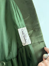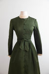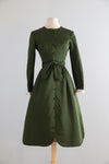 This stunning late 60's Chester Weinberg dress embodies timeless sophistication with its structured silhouette and impeccable tailoring. Crafted from rich olive green silk satin, it features a row of self-covered buttons down the front, a fitted waist accented by a matching sash belt, and a gracefully flared skirt with a subtle scalloped hem. Cream silk cuffs with tiny covered buttons add an elegant contrast, while Weinberg’s precise seaming and flawless construction highlight his reputation as one of America’s most refined designers of the era. Fully lined and beautifully finished, this piece captures the quiet glamour and modern femininity that defined Weinberg’s best work. Perfect for a holiday event. In excellent condition, freshly dry cleaned and ready to wear.