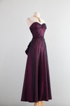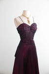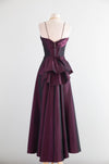 The gown nips into a wasp-waist through expertly ruched seams, then floats into a full, sweeping skirt that glides effortlessly. A cascading layered peplum at the back—one of the most enchanting features—adds volume, movement, and classic mid-century allure. The effect is pure Old Hollywood: elegant, feminine, and made for an unforgettable entrance. In excellent condition, freshly dry cleaned and ready to wear.