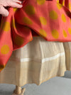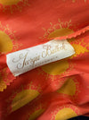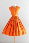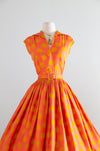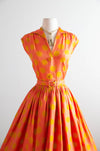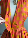 Radiant and full of mid-century charm, this 1950s silk dress by Georgia Bullock of California embodies the playful sophistication of the era. Crafted from luminous coral silk patterned with mustard yellow sunbursts, it features a softly structured bodice with a notched collar, covered buttons, and a matching belt that cinches the waist before falling into a full, pleated skirt. The interior reveals a built-in petticoat that adds flattering volume and a graceful silhouette.