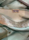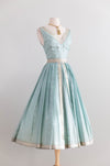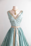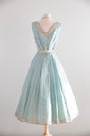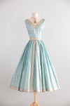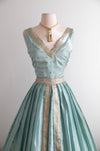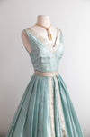 This absolutely stunning 1950s cocktail dress is crafted from luminous Indian sari silk in a fresh aqua hue, prized for its soft drape and subtle sheen. The sleeveless, fitted bodice features a flattering V-neckline trimmed in ornate gold brocade, echoed at the defined waist with an attached sash. From the waist, a full pleated skirt falls beautifully, accented by a vertical panel of coordinating gold brocade that elongates the silhouette. The hem is finished with matching brocade trim for a refined, cohesive look. The back repeats the V-shaped neckline, and a period-correct metal zipper is set neatly into the side seam. Fully lined, this dress perfectly marries mid-century tailoring with the richness of traditional sari silk. Even prettier in person, perfect for a special occasion or bridal look. In overall excellent condition, freshly cleaned and ready to wear.