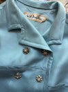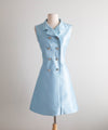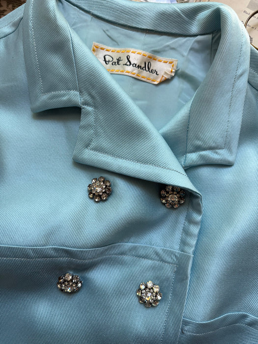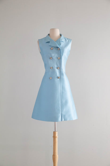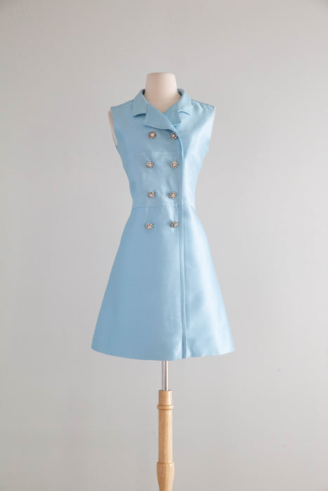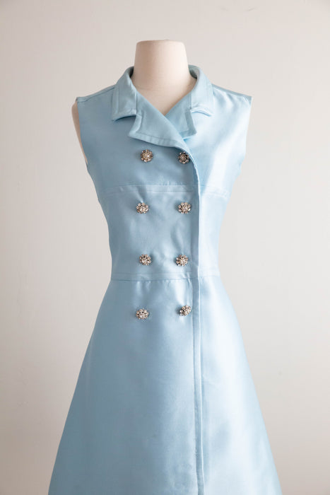 Iconic 1960's Tiffany Blue Shantung Silk Cocktail Dress By Pat Sandler. This timeless sleeveless shift dress boasts rhinestone buttons and is fully lined for ultimate comfort. Channel your inner Jackie Kennedy and make a statement in this elegant and exclusive piece. Perfect for a myriad of special occasions.
