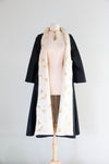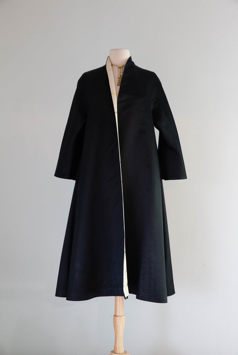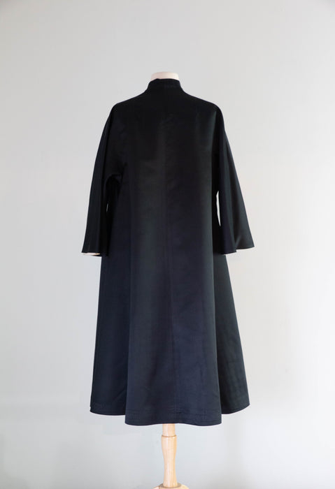 Absolutely gorgeous 1950's Chinese embroidered silk evening swing style fully reversible coat. Impeccable construction and fit, made of the finest silk. Wear it either way, this timeless and elegant piece is perfect for an evening out or special occasion. The most elegant silhouette, fitted at the shoulders and flared to the hem. In excellent condition, freshly dry cleaned and ready to wear.
