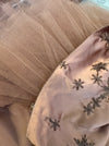 utterly stunning 1950's couture made embroidered evening dress in rosewood satin. Featuring a strapless boned bodice and a full gathered skirt with lining and a layer of fluffy tulle under the skirt. Zips up the side with original metal zipper. In excellent condition, freshly dry cleaned and ready to wear.