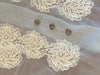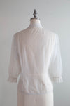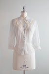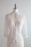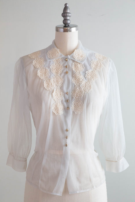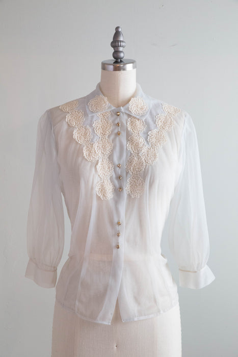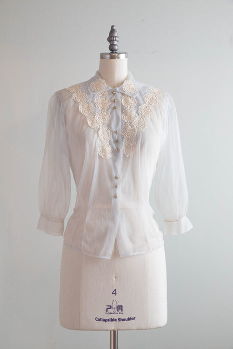 Exceptionally lovely 1950's pale powder blue sheer nylon blouse with cotton floral lace appliques and rhinestone buttons. Princess seams showcase the waist and three quarter sleeves. Just the prettiest thing ever!