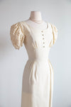 Darling late 1950's ivory wiggle dress in a soft cotton rayon blend that feels like crisp linen. Featuring the classic cummerbund style waist, a fitted skirt, demure decorative buttons on the bodice and original metal zipper up the side. The stand out feature is the wonderfully articulated puff sleeves that feature eyelet embroidery and three d floral appliques. Perfect for a bridal related event. In overall excellent condition, freshly dry cleaned and ready to wear.