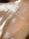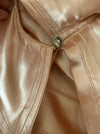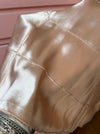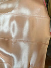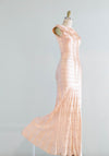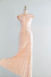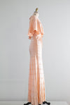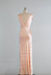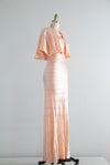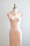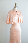 Absolutely stunning 1930's ballet pink liquid satin bias cut evening dress with matching cape. This exquisite dress features dramatic gradient ribbed stitching the accentuate the figure and create a mermaid effect. Paired with a darling art deco style cape-let that fastens at the neck with a rhinestone button. Slips on effortlessly over the head and stretches to fit. The gown has a low back and a cowl neckline held in place with a fabric covered metal weight. A truly exquisite gown in excellent condition, worthy of the most special of occasions.