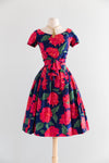 Absolutely gorgeous late 1950's polished cotton cocktail dress in a luscious midnight floral print. Featuring a broad scoop neckline, cap sleeves, a shirred defined waist with accent bow and full box pleated skirt. A tulle crinoline is attached at the waist to provide fullness to the skirt. Fully lined in silk organza. Perfect for a myriad of special occasions. Zips up the back with original zipper. In pristine condition, freshly cleaned and ready to wear.