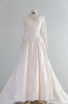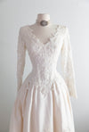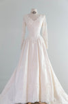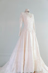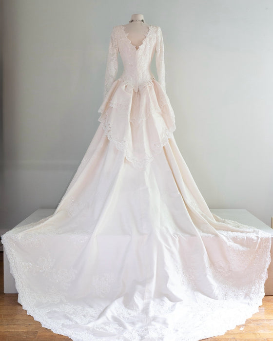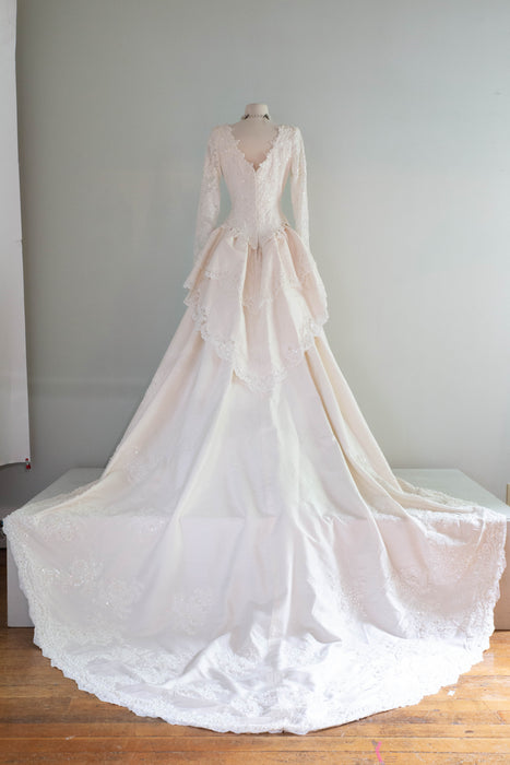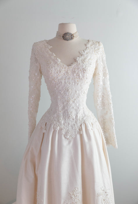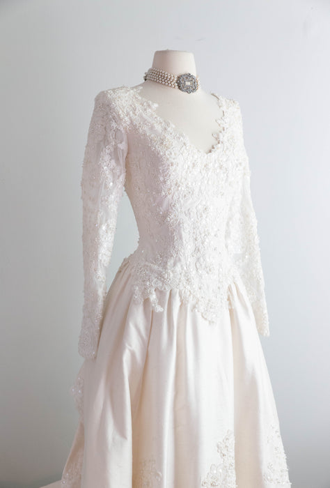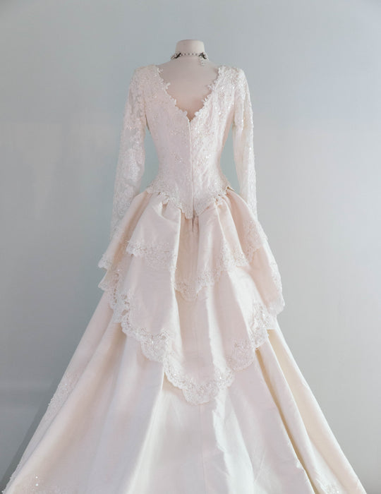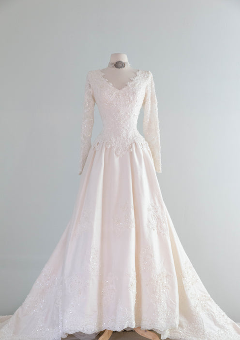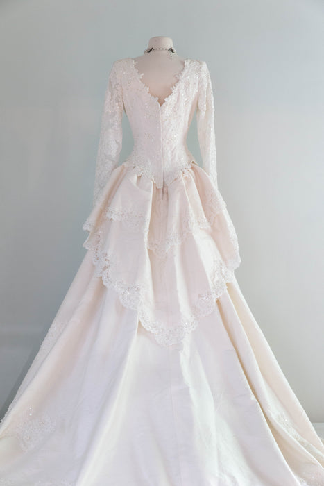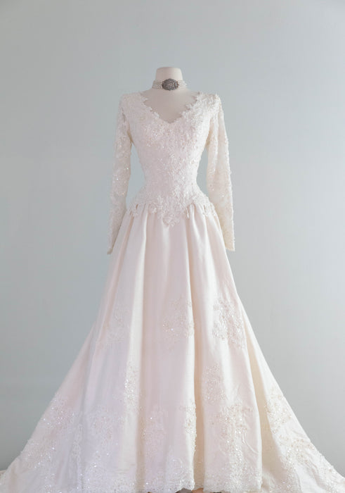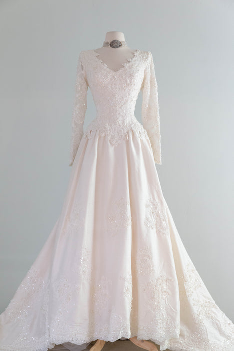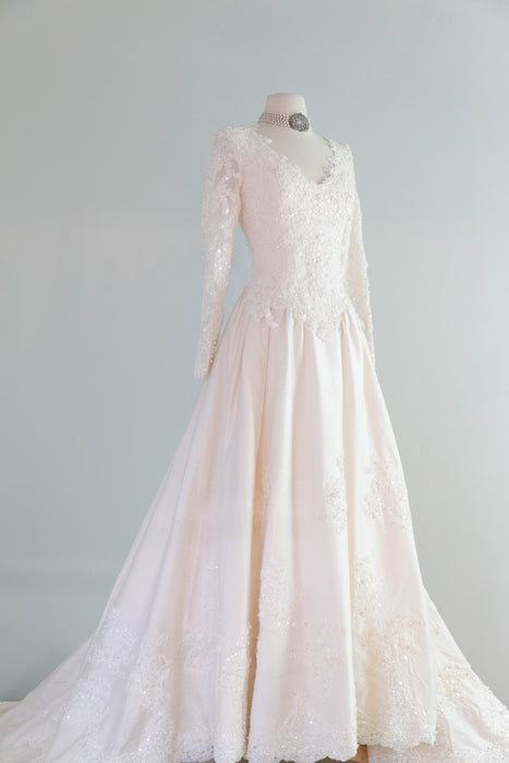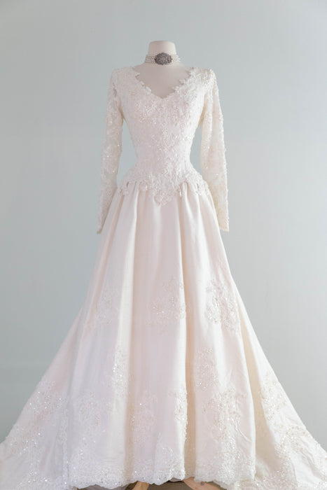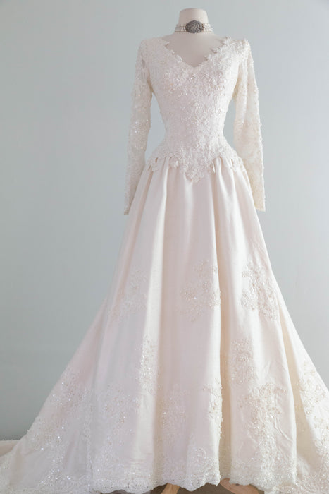 Vintage Fairytale Wedding Gown In Silk With Beaded Alençon Lace & Cathedral Train / M