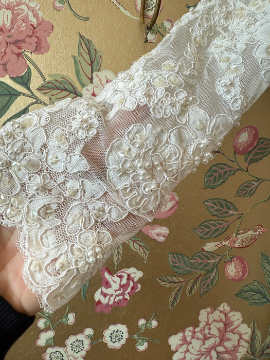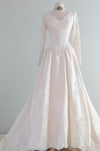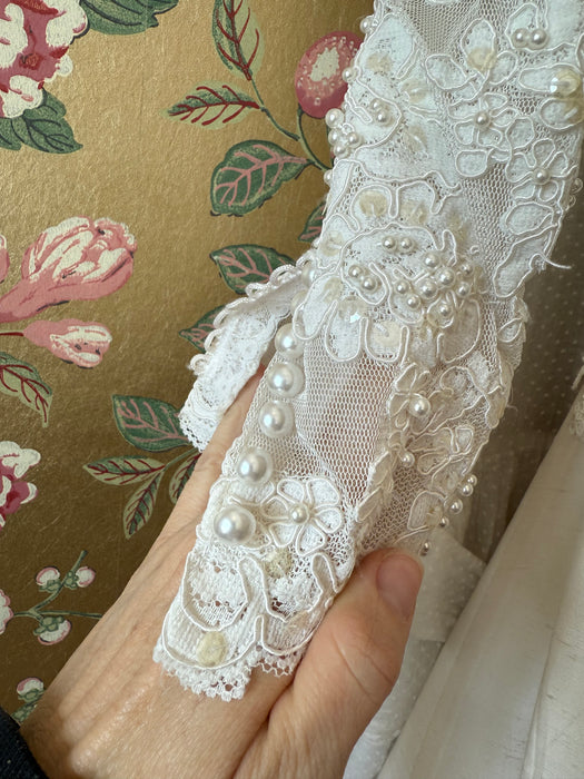 Feel like a fairytale princess on your wedding day with our Vintage Fairytale Wedding Gown! Made with luxurious silk and adorned with intricate beaded lace, this gown exudes elegance and romance. And with its stunning cathedral train, you'll make a grand entrance that will leave your guests in awe. Featuring a fitted lace bodice with semi sheer long sleeves and pearl buttons, a massive full skirt with hand embroidered lace appliques embellished with sequins and pearls and a dramatic long train. Fully lined interior. I absolutely love the details in the back. In excellent condition, freshly dry cleaned and ready to wear.