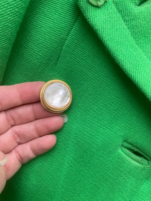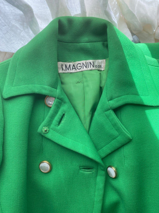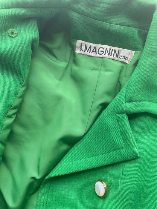 Iconic and utterly fabulous 1960's 100% wool structured maxi coat in a bold shade of spring green from I. Magnin. Beautifully constructed style, with double breasted front and gold and pearl buttons. Long kick pleat in the back for easy movement along with cute pockets. Fully lined interior. In excellent condition, clean and ready to wear.