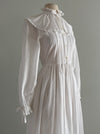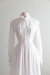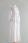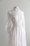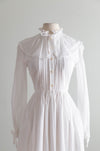 This romantic 1980's Laura Ashley wedding dress evokes the quiet grace of a Jane Austen heroine, recalling the pastoral elegance of Sense and Sensibility and Pride and Prejudice. Crafted in airy ivory cotton voile with a delicate Swiss dot texture , the gown features a softly ruffled high neckline, an oversized ruffled collar, and a finely pleated bodice that buttons through the front. Long, sheer sleeves finish with gentle ruffled cuffs and ties, while the lightly gathered lined waist flows into an effortless, ankle-grazing skirt complete with hidden side pockets. Understated and poetic, this is a dress for a bride drawn to Regency-inspired restraint, intimacy, and timeless English romance. Made in the UK. In excellent condition, freshly cleaned and ready to wear.