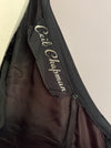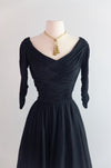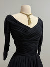 Ceil Chapman’s mastery of draped jersey is on full display in this late 1950s cocktail dress in midnight blue. The fitted bodice is constructed entirely of intricately crosshatched ruching in silk jersey, with the fabric manipulated into a deep V at both front and back — the rear dĆ©colletage a signature Chapman flourish that balanced propriety with allure. Three-quarter sleeves continue the ruched treatment to the wrist. Below a defined waist, the skirt shifts to layers of silk chiffon cut in a full circle, falling to cocktail length with characteristic weightless movement. The metal zip closure runs center back through the bodice. The label reads ā€œCeil Chapmanā€ in silver script on black grosgrain. Fully lined interior. Original metal zipper up the back. In excellent condition, freshly dry cleaned and ready to wear.Ā