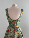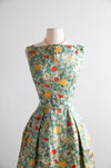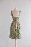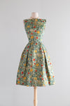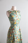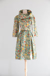 This exquisite late-1950s silk brocade cocktail dress and matching jacket set embodies the height of mid-century sophistication. The painterly floral brocade—alive with soft greens, buttery yellows, and vivid coral roses—is subtly flecked with metallic gold, giving the entire ensemble a luminous, almost Impressionist shimmer. The fabric alone signals quality: richly woven, weighty, and designed to catch the light with every movement.