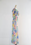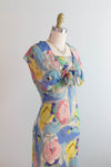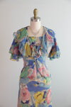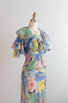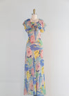 This rare 1930's ensemble showcases the era's refined artistry through a bias-cut gown crafted in silk chiffon adorned with impressionist floral motifs. The semi-sheer fabric drapes exquisitely in an hourglass silhouette, while delicate flutter sleeves enhance its ethereal quality. Accompanied by a matching jacket with a distinctive ruffled collar and rhinestone closure, this exceptional set is in excellent condition. The pastel color palette evokes the dreamy aesthetic of pre-war elegance—a museum-worthy example of 1930s couture craftsmanship. Snaps up the side for easy getting in and out of. Freshly cleaned and ready to wear.