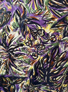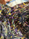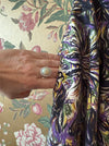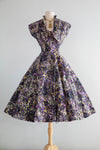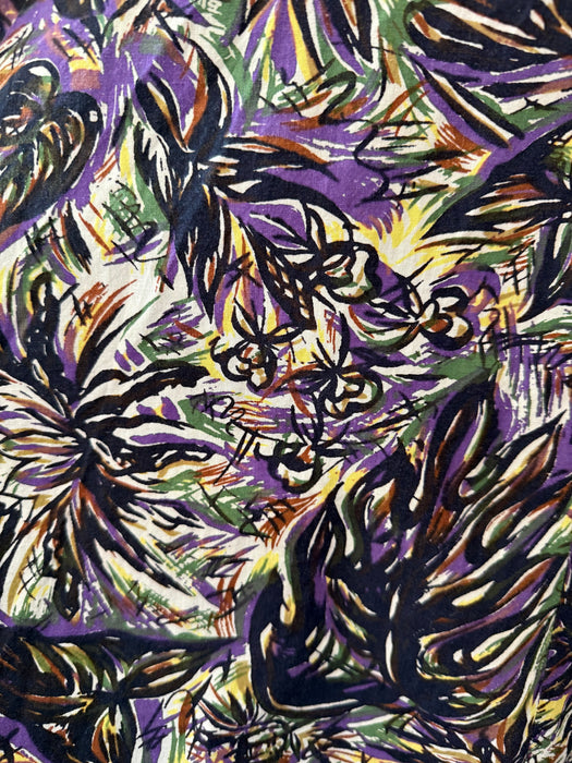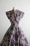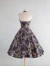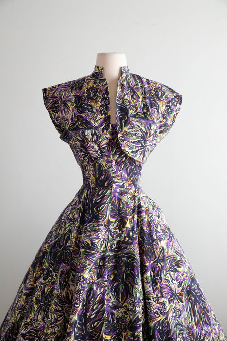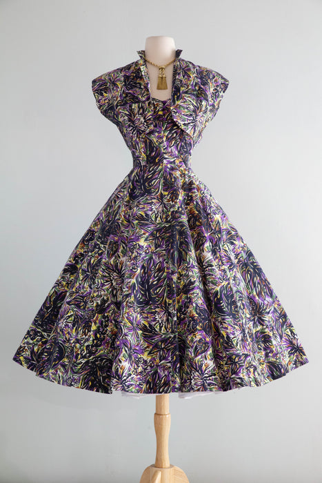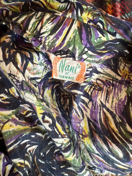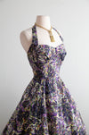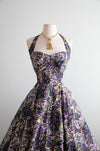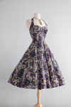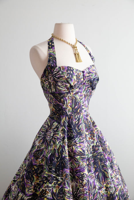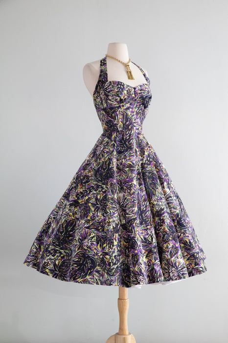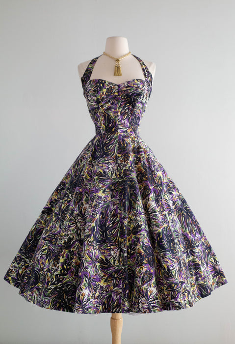 Absolutely gorgeous 1950's Hawaiian halter dress by Nani Hawaii. Made of a crisp cool cotton in a dark lush tropical print with shades of eggplant, yellow, green and black. Featuring a sculpted bust with interior support and accented with hand tied purple buttons. Complete with matching bolero. A full skirt with convenient side pockets. Zips up the back with original metal zipper. In excellent condition,, freshly cleaned and ready to wear.
