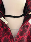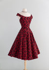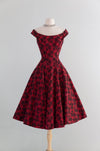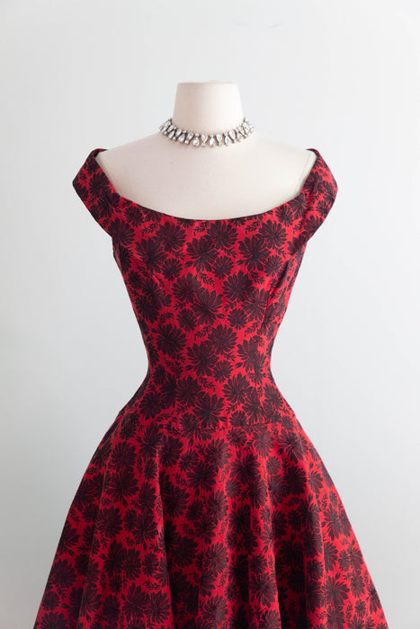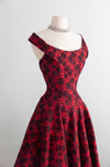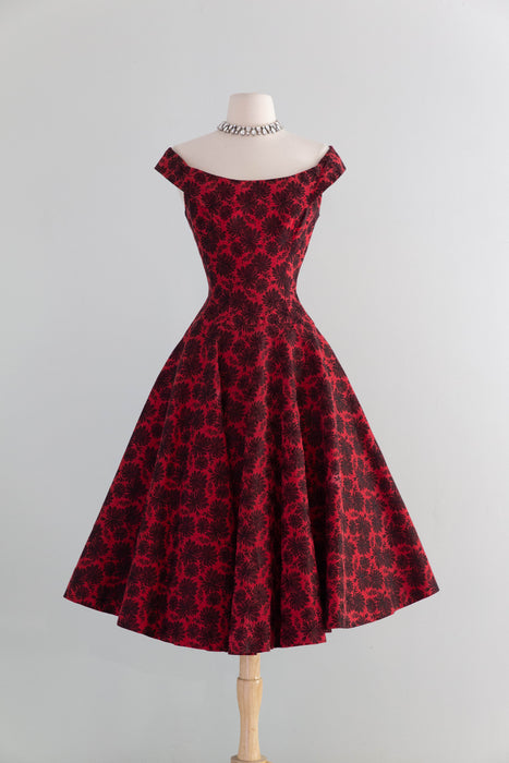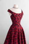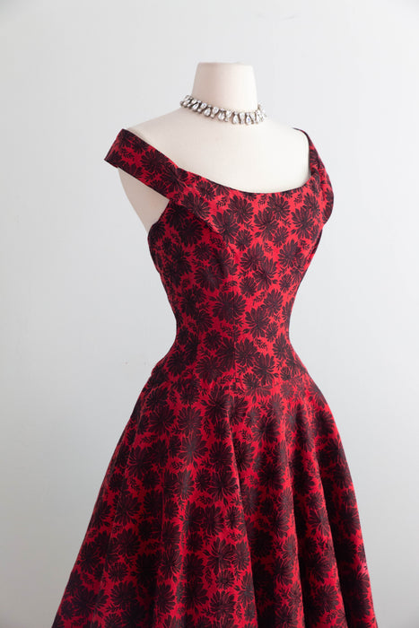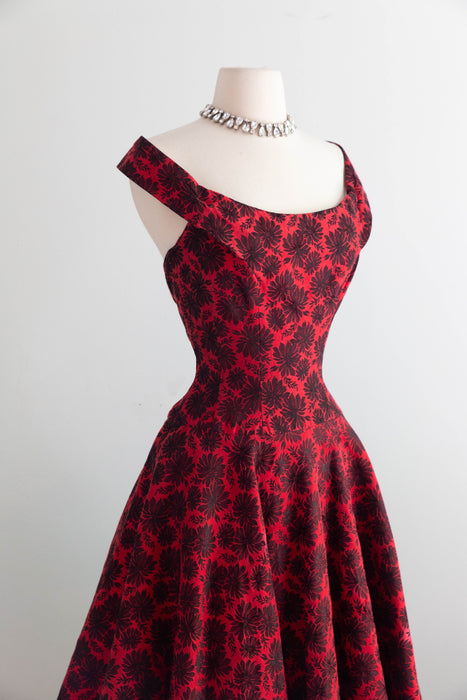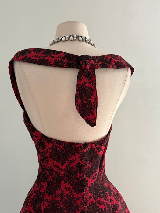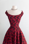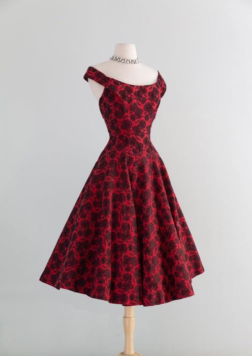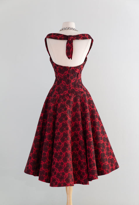 Stunning 1950's Estevez Crimson & Black Floral Brocade Cocktail Dress / SM