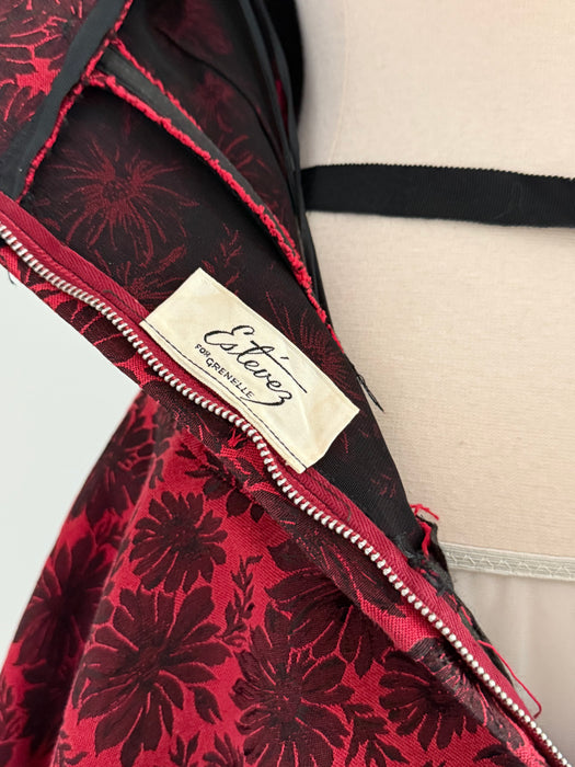 Step into timeless elegance with this stunning 1950's Estevez cocktail dress. Featuring a dramatic off-the-shoulder neckline and an alluring open back, this crimson and black floral brocade piece captures the glamour of classic Hollywood icons like Sophia Loren. The fitted waist and full flared skirt create a flattering silhouette, perfect for making a memorable entrance. Crafted with couture quality, this high-end designer dress embodies vintage sophistication and style. Zips up the back with original metal zipper. In excellent condition, freshly dry cleaned and ready to wear.
