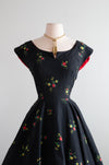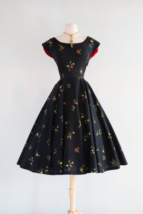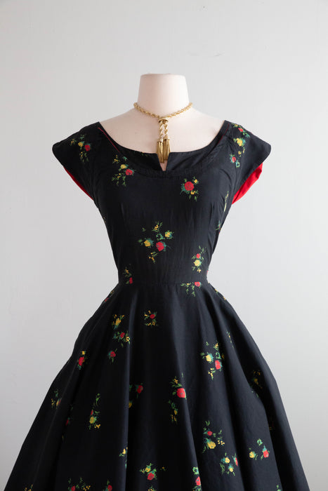 Gorgeous 1950's Cover Girl Miami Cotton Party Dress With Floral Print and Red Trim / SM