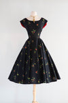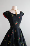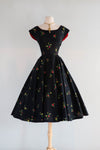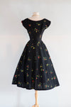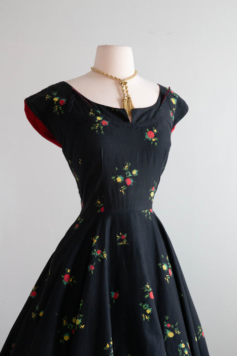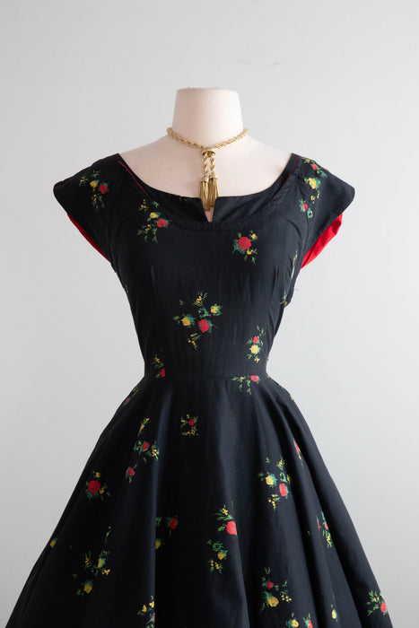 This Gorgeous 1950's Cover Girl Miami Cotton Party Dress is a classic beauty. Made of black polished cotton with a red and yellow rose print, it features a fitted waist and full skirt, complete with side pockets and a zip closure on the side. Perfect for any party, this dress exudes elegance and style. In excellent condition, freshly cleaned and ready to wear.