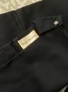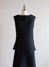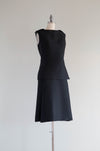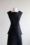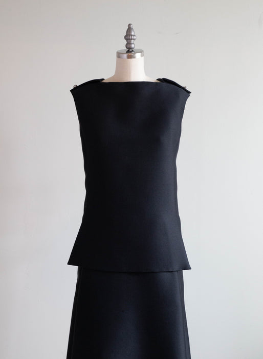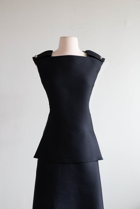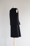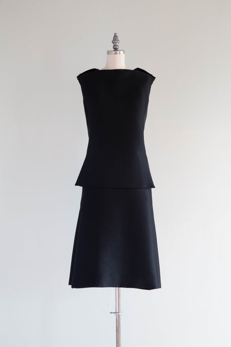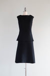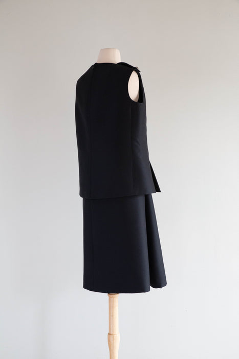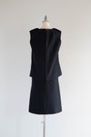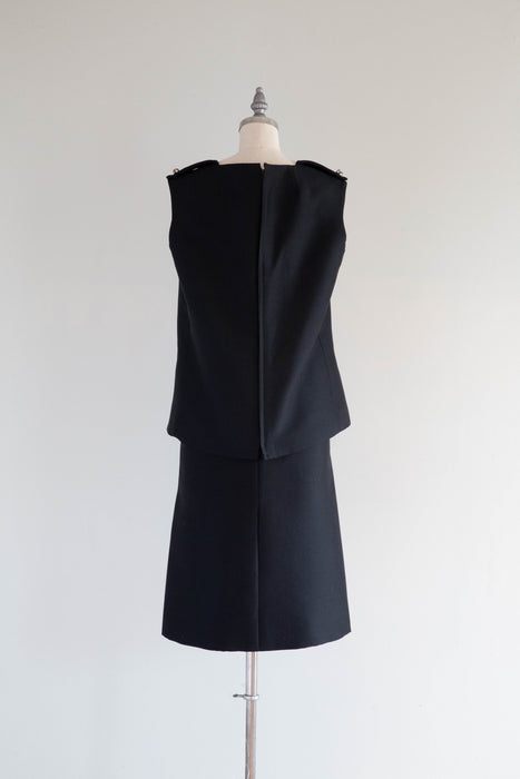 Chic and timeless 1960's black wool and silk cocktail dress by high end midcentury designer Teal Traina. This ultra modernist dress consists of two pieces: a fitted under dress and a boxy outer layer with epaulets and rhinestone baubles. Deep pleats in the front of the dress complement the shape of the top. Zips up the back and fully lined. In excellent condition, freshly dry cleaned and ready to wear.