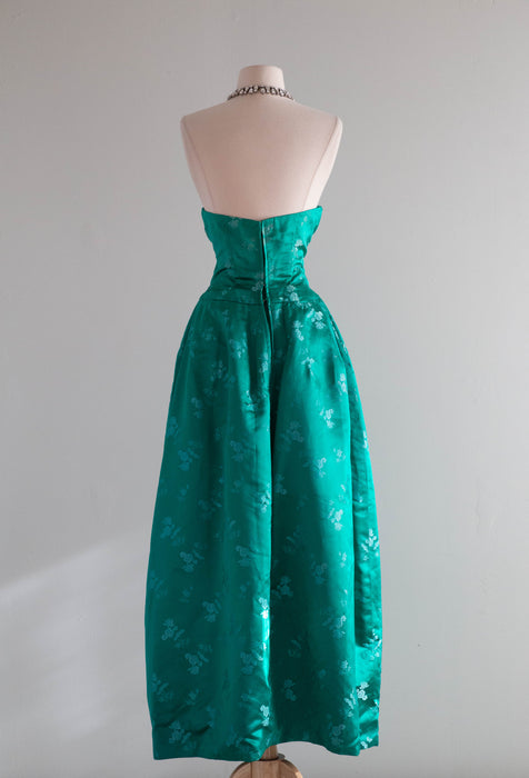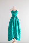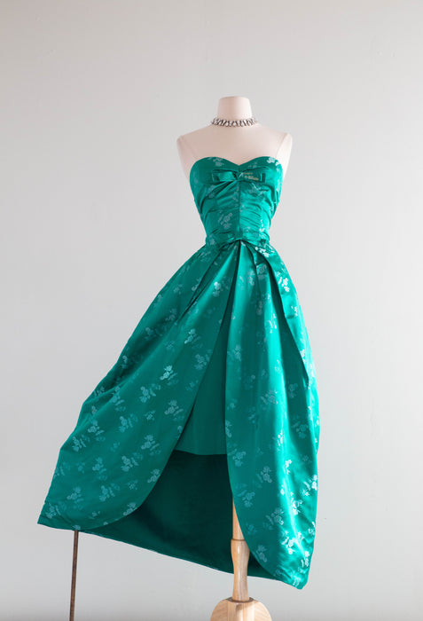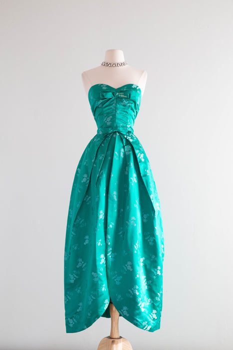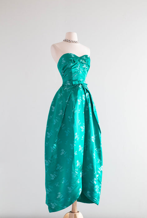 One of my absolute favorite gowns this holiday season! Couture made from the most luxurious Chinese silk in a brilliant peacock green and featuring a strapless sweetheart bodice and a dramatic break away tulip skirt that reveals a fitted shorter skirt. The bodice is accented with two bows. Zips up the back with original metal zipper. In excellent condition, freshly dry cleaned and ready to wear.