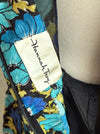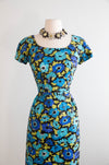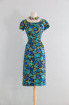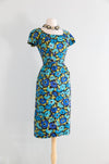 Sophisticated Late 1950's Silk Floral Print Cocktail Dress With Black Sequins By Hannah Troy / M