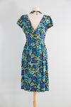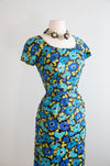 Personally I am obsessed with this dress. From the late 50's early 60's period and designed by Hannah Troy. Made of silk and embellished with shimmering black sequins that highlight the gorgeous blue floral print. Impeccably made and constructed, featuring a fitted skirt, short sleeves, an attached waist band and scoop neckline. Fully lined in silk and in excellent condition. Freshly cleaned and ready to wear.