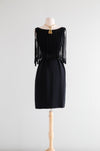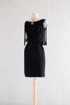 Experience mid century glam in our 1960's little black dress! Made from premium black rayon crepe, this cocktail dress features a fitted waist, elegant boat neckline, and swinging tasseled fringe across the bodice.  Zips up the back and fully lined. So much fun! In excellent condition, freshly dry cleaned and ready to wear.