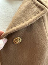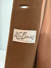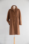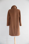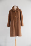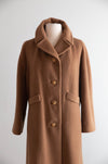 This elegant 1960's coat is crafted from a luxurious wool and camel hair blend, offering exceptional softness, warmth, and a beautifully fluid drape. Rendered in a rich cognac brown, the color enhances the coat’s timeless mid-century appeal and underscores the natural depth of the fibers.