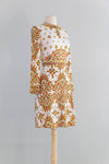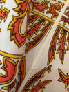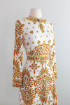 Fabulous 1970's orange and yellow Italian baroque print nylon jersey dress from Saks Fifth Ave. Featuring a classic fitted waist, long sleeves and zipper up the back. I love the border print along the cuffs, hem and neckline. I see a faint signature in the print but can't decipher what it says. In the iconic style of Pucci, Bessi and Leonard. In excellent condition, freshly cleaned and ready to wear.