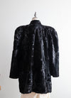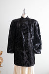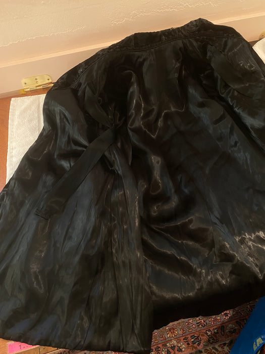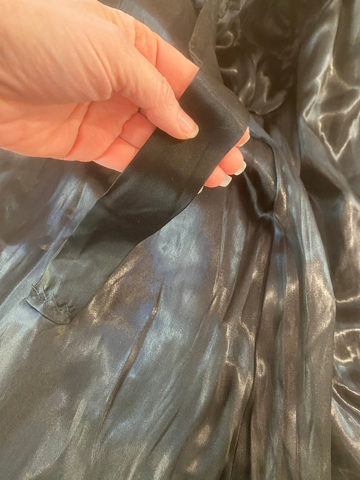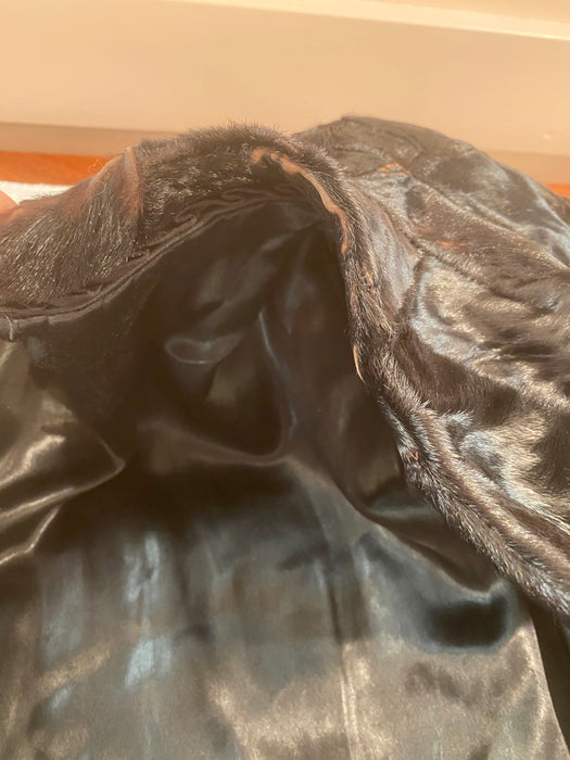 The ultimate in 1940's glamour! The glossiest, deepest obsidian black fur coat from the early 1940's. Featuring strong shoulders, flared to the hem sleeves and a discreet hook and eye closure. Made from genuine fur, what exact kind I am uncertain. Fully lined in silk satin crepe and complete with side pockets. In overall excellent condition, clean and ready to wear.