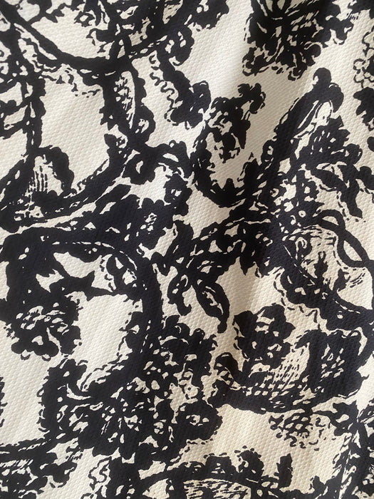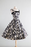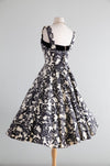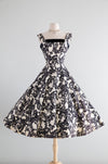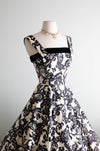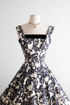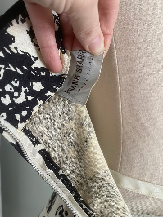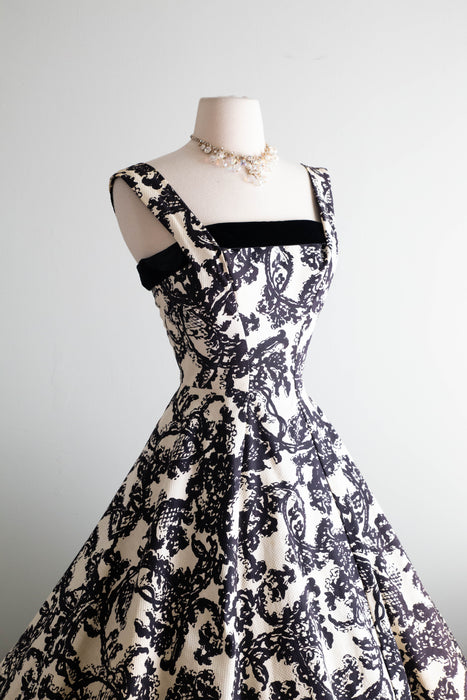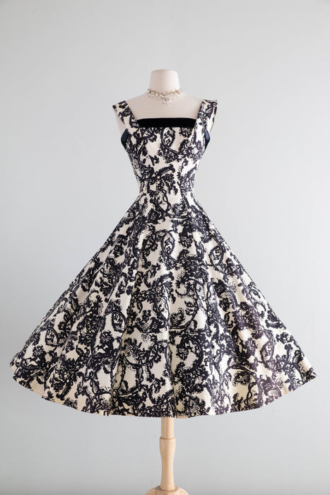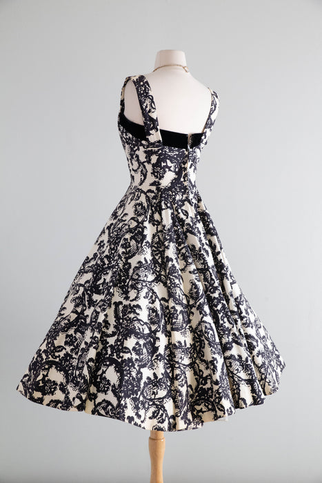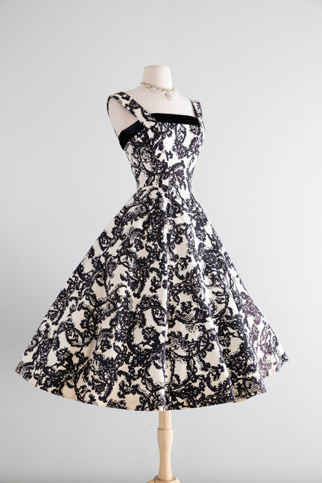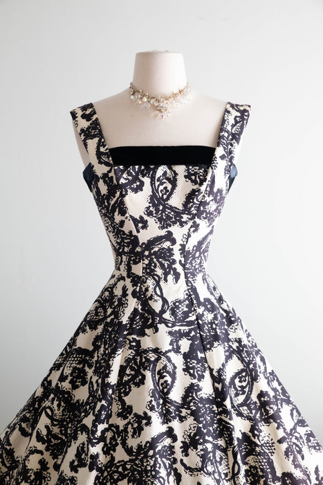 Stunning 1950's New Look era black and ivory baroque print cocktail party dress by designer Frank Starr. Impeccably constructed out of a crisp cotton pique fabric and featuring a sculpted bodice with rolled straps and black velvet trim. Ultra fitted waist and full paneled skirt with built in crinoline. The perfect special occasion dress. Zips up the back with original metal zipper. In overall excellent condition, freshly dry cleaned and ready to wear.