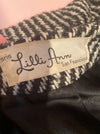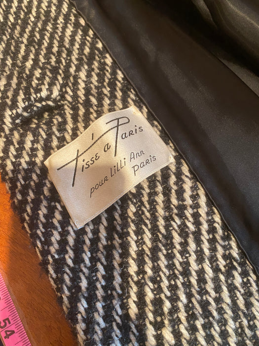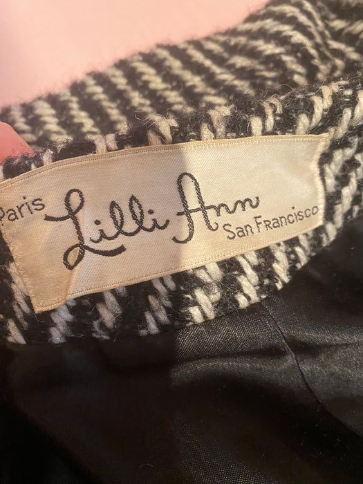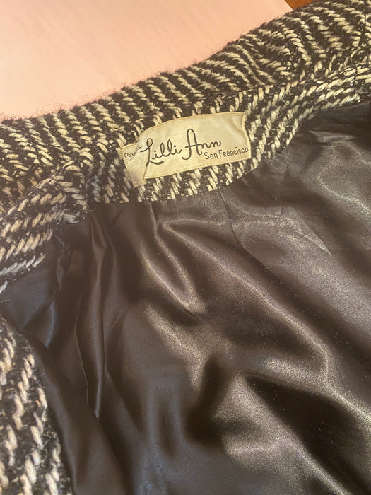 Absolutely fabulous 1960's zebra striped black and white wool swing coat by Lilli Ann. Featuring an adorable folding ring collar, three quarter sleeves, side pockets and a flattering swing style silhouette. Meant to be fitted at the shoulders and flowing to the hem. Lined in silky black satin. In excellent condition, freshly dry cleaned and ready to wear.