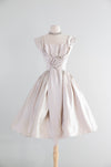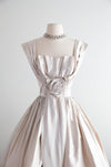 Stunning 1950's Silver Satin Party Dress With Rosette & Full Skirt / Small