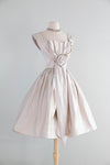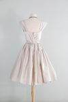 Absolutely stunning late 1950's silver satin party dress with pleated shoulders and neckline. Beautifully constructed with a cinched waist, full gathered skirt, attached interior crinoline and a charming rosette at the center. Zips up the back with original metal zipper, in excellent condition, freshly dry cleaned and ready to wear.