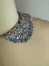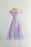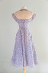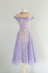 Hands down one of the prettiest dresses by Peggy Hunt I have ever seen! I have been a fan of Peggy for decades. Known as the queen of the illusion neckline, Hunt was one of the first designers to use sheer "nude" fabric to enhance and decorate the neckline of dresses. This particularly charming dress from the 50's showcases her genius perfectly. Featuring a sequin embellished Peter Pan collar above a fitted waist and full flowing skirt. A self fabric waist sash closes in the back with a bow. The interior is lined and includes a cotton organdy petticoat to showcase the skirt. In excellent condition, freshly cleaned and ready to wear.