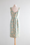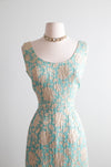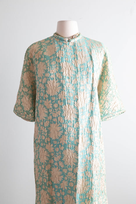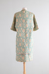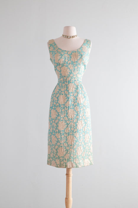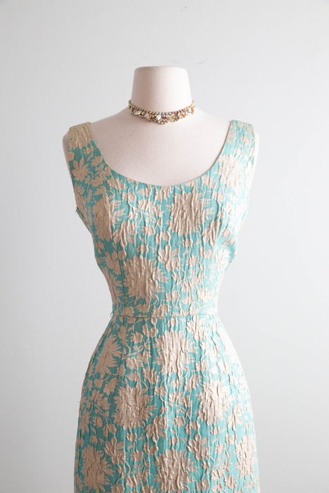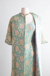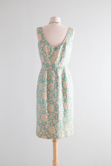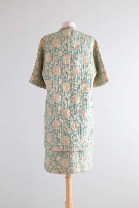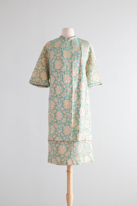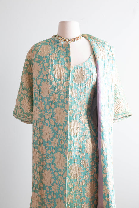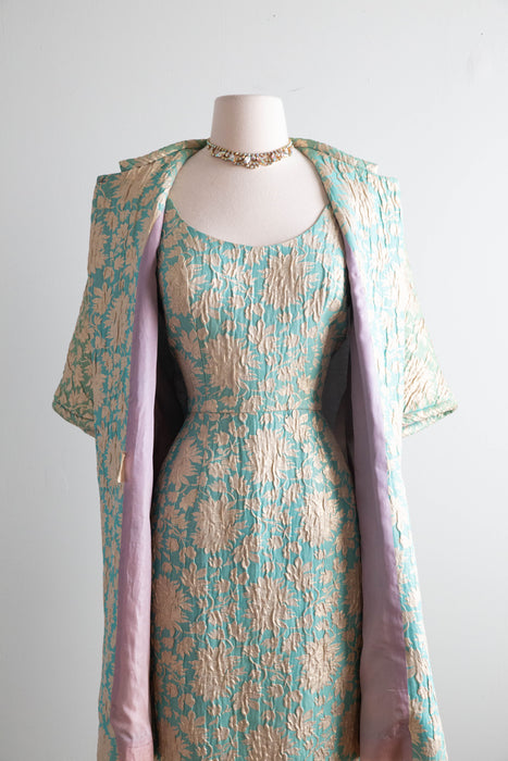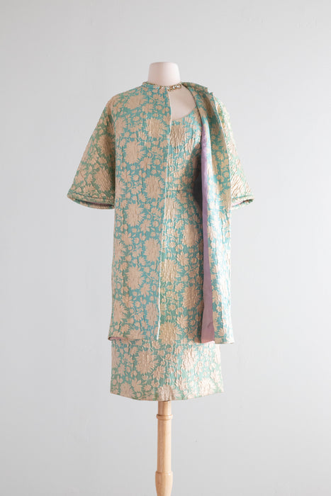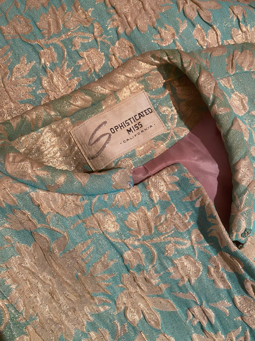 Glamorous Early 1960's Gold & Aqua Brocade Cocktail Dress & Coat Set / SM