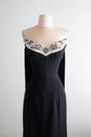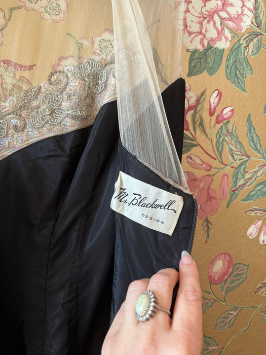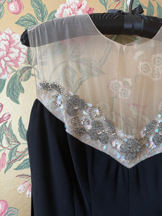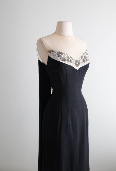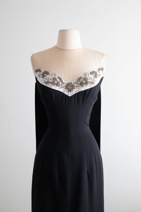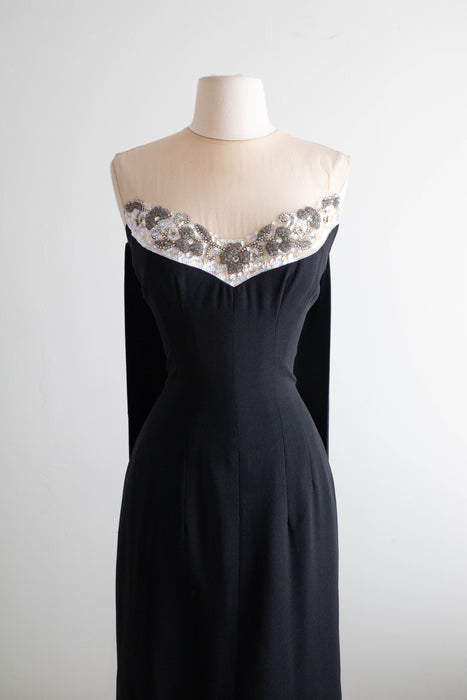 Indulge in luxury with this Iconic Late 1950's Little Black Dress from Mr. Blackwell. The hourglass silhouette accentuates your figure, while the sheer illusion neckline embellished with rhinestones, beads, and aurora sequins exudes sophistication. Dramatic back flaps and a zipper closure add a touch of glamour to this iconic cocktail dress by a design legend. Fully lined interior. In overall excellent condition, freshly dry cleaned and ready to wear.