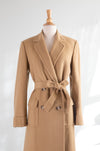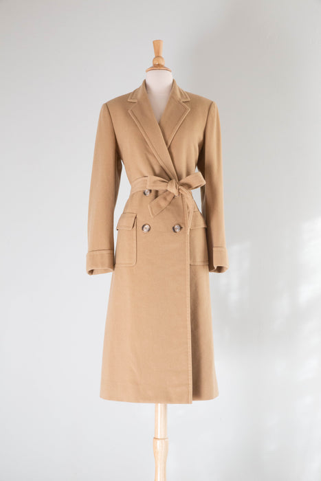 A wardrobe staple in luxurious camel hair. Vintage 60's era 100% camel hair long line coat with optional belted waist, front pockets and back belt. Classic menswear styling but made for a woman. Custom made in Hong Kong. Fully lined and in excellent condition, freshly dry cleaned and ready to wear.