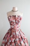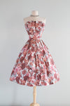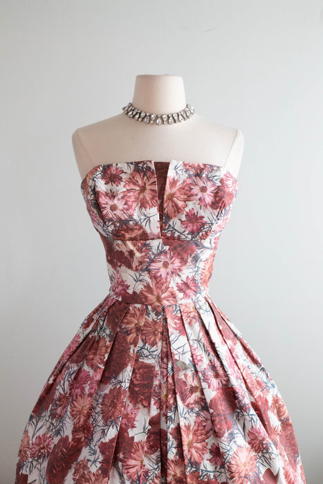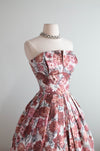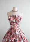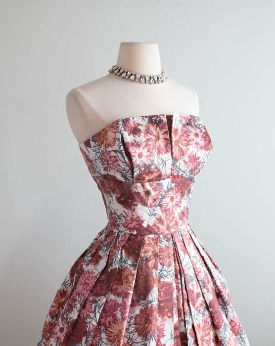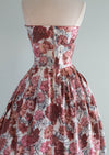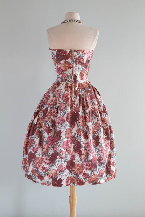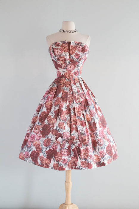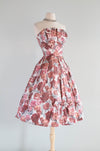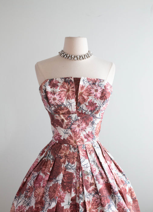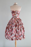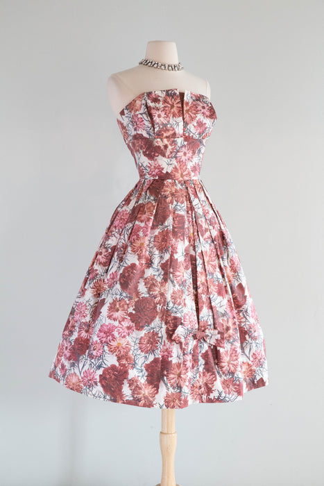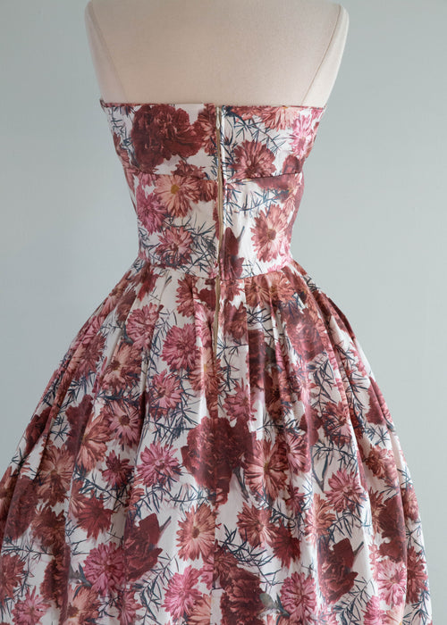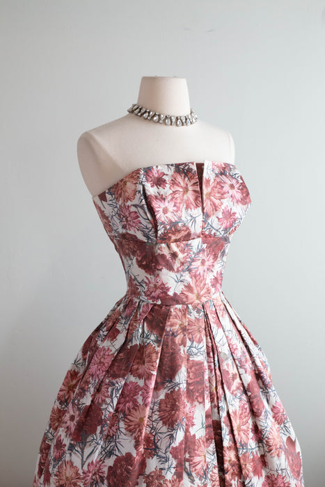 Stunning 1950's Couture Polished Cotton Carnation Print Party Dress / Small