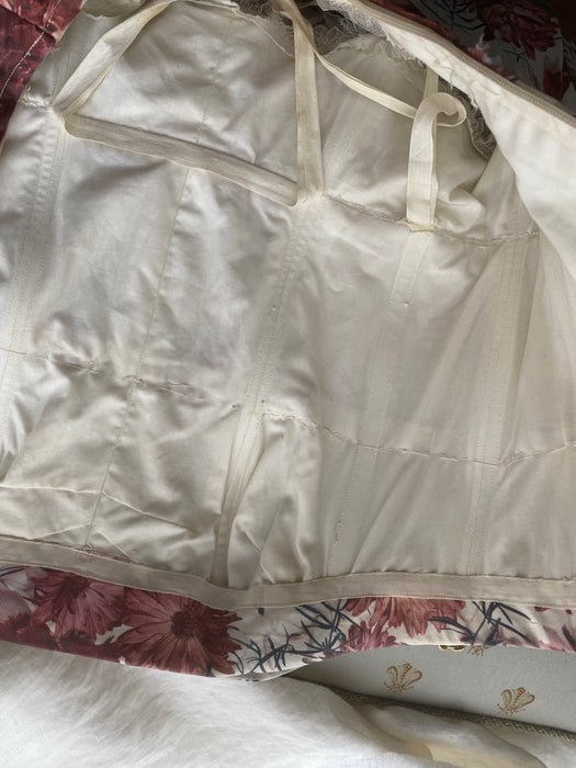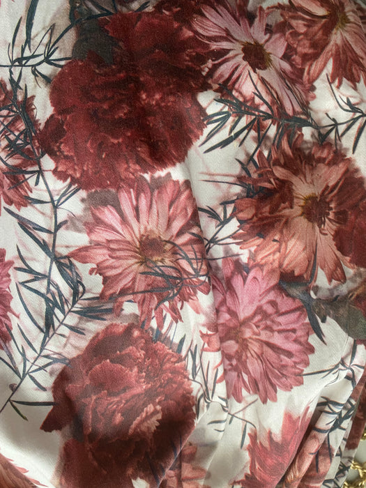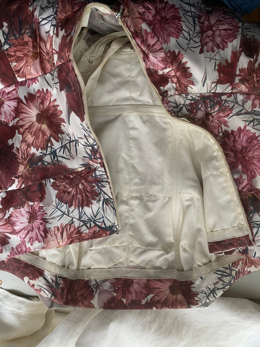 Stunning 1950's couture made party dress in polished cotton. Featuring a luscious floral print in shades of rose, burgundy and hints of yellow. Carnations, mums and daisies make up the print. The bodice is lined with a boned built in corset for support and structure. The skirt is lined in tulle for fullness. Zips up the back with original zipper. No label found but looks to be couture made. In excellent condition, freshly dry cleaned and ready to wear.
