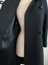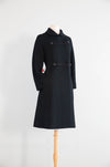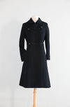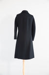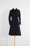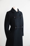 From my personal collection to yours! One of my very favorite wool coats from the 1960's. The cut is just so cute! The front features ornamental soutache loop closures, fastened by striking faceted black beaded buttons that catch the light with understated sparkle. A neat rounded collar and slim bracelet-length sleeves emphasize the polished lines, while hidden side pockets provide a touch of practicality. Fully lined in satin, the coat is finished with meticulous tailoring throughout, ensuring it drapes gracefully from shoulder to hem. In excellent condition, freshly dry cleaned and ready to wear.