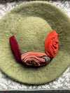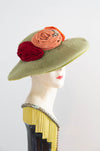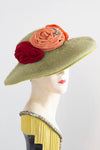 At the crown, three sumptuous velvet rosettes in shades of coral, orange, and deep red bloom dramatically across one side, accented by a sparkling rhinestone crescent that catches the light with every turn of the head. The bold floral motif adds just the right touch of glamour and contrast against the cool green base—a color palette quintessentially evocative of postwar couture millinery.