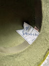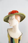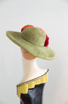 A spectacular example of mid-century millinery artistry, this 1950s wide-brim hat from Lazarus Paris–Cincinnati exudes both Parisian sophistication and American flair. Crafted in luxuriously soft chartreuse green fur felt, the hat’s sweeping brim is edged in matching velvet, lending a refined finish and structured silhouette.
