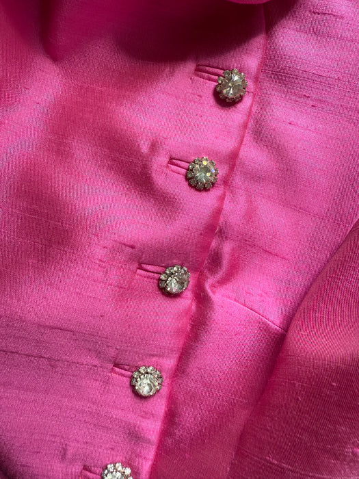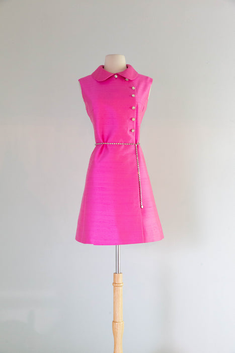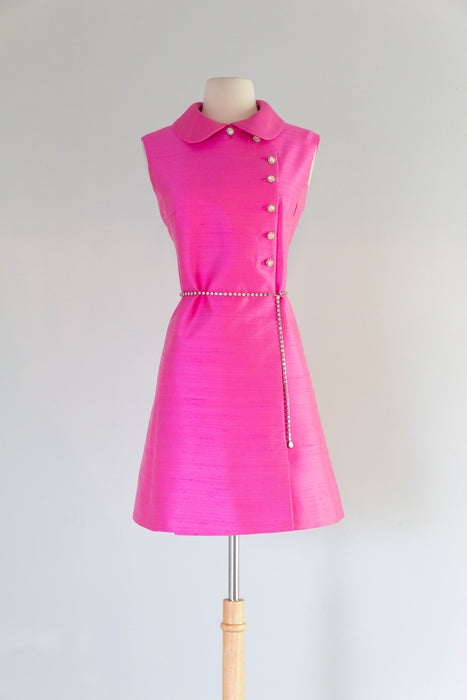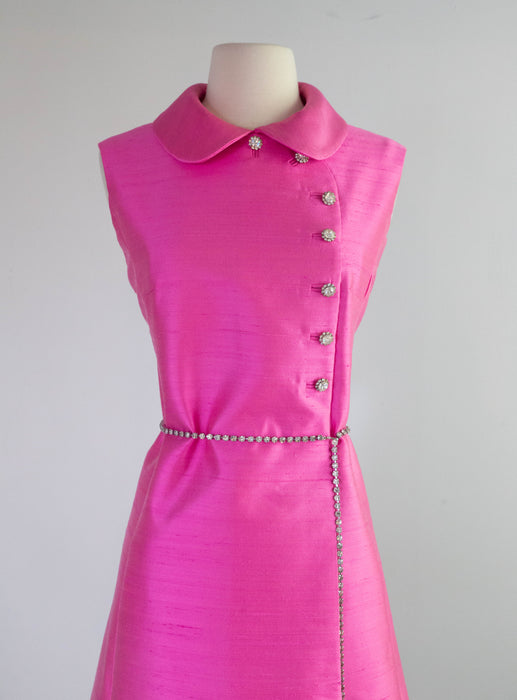 Absolutely Fabulous HOT PINK Shantung Silk Cocktail Dress. Showcasing a classic shift style dress with a peter pan collar, rhinestone buttons and glamorous rhinestone belt, and complete with hidden front pockets and a back zipper. Just about as fabulous as it gets! In excellent condition, freshly dry cleaned and ready to wear.