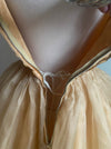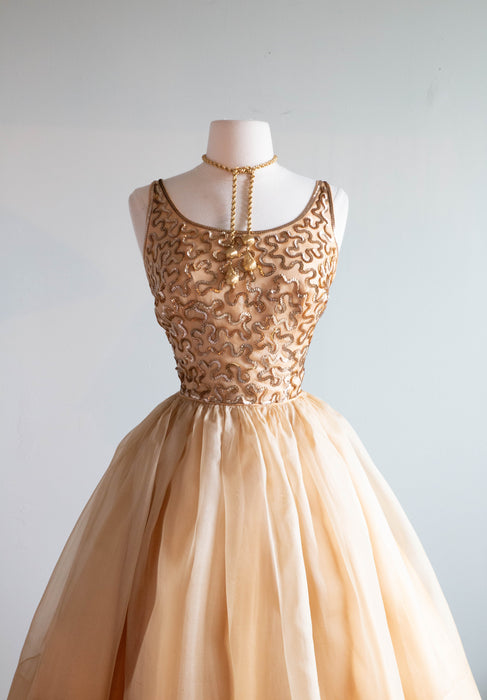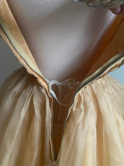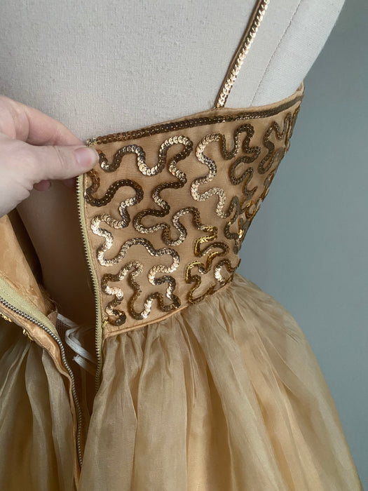 Indulge in vintage glamour with our Stunning Gold Sequined Party Dress. The 1950's style features a nipped waist, full organza skirt, and metal zipper for a perfect fit. The built-in petticoat adds an extra touch of elegance. Turn heads and be the life of the party in this luxurious dress. In overall excellent condition, freshly dry cleaned and ready to wear.