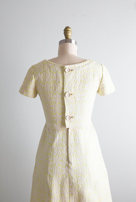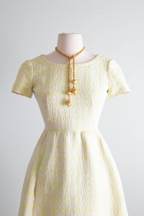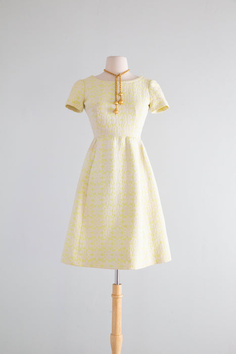 The epitome of spring by one of the worlds most celebrated designers. Made by Givenchy in France and sold in the US by Bergdorf Goodman. Impeccably crafted from a woven cotton brocade in a bright light green with ivory floral pattern. Featuring a high waist, fitted bust, short sleeves, front hidden pockets and buttons up the back. A great opportunity to own a piece by a design legend! In overall excellent condition, freshly cleaned and ready to wear.